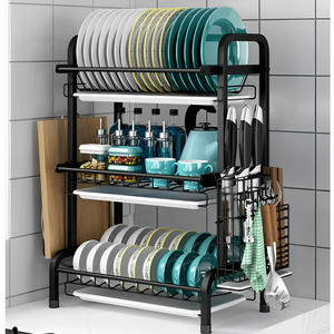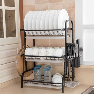 Adaugă ordine, eleganță și eficiență în bucătăria ta cu acest raft metalic triplu pentru vase, conceput pentru uscarea și depozitarea completă a veselei.